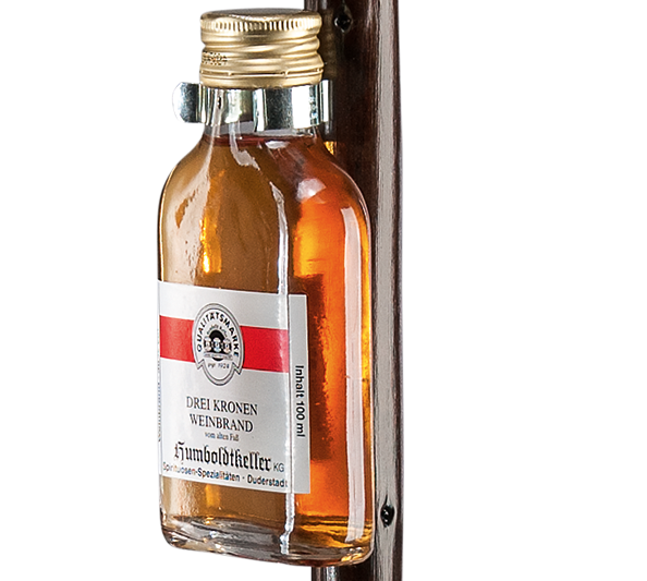 Une flasque de 0,1 L incluse, remplie de votre choix de liqueur aux herbes ou de cognac.