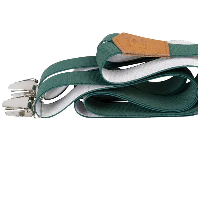 Les bretelles "Croix Rousse", longues de 120 cm et fines de 25 mm, offrent une silhouette élégante et confortable. Elles sont composées de bandes élastiques vertes (82% Polyester et 18% Élastodiène), sublimées par un empiècement en cuir marron (100% croûte de cuir de vachette) estampillé "Les Bretelles de Léon".
