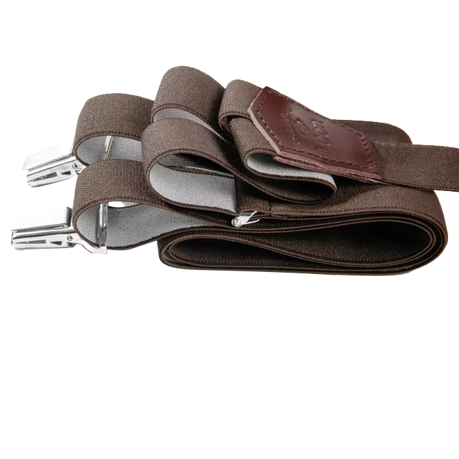 Longues de 120 cm et larges de 35 mm, les bretelles "Marron des Champions" sont confectionnées avec soin à partir de bandes élastiques marron (82% Polyester et 18% Élastodiène). Elles sont reliées par un empiècement central en cuir marron (100% croûte de cuir de vachette), estampillé avec fierté "Les Bretelles de Léon".