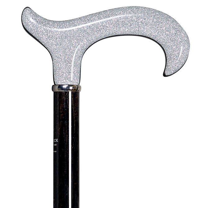 Sa poignée DERBY en acrylique est ornée d’un effet pailleté argenté, ajoutant une touche d’éclat et d’élégance.