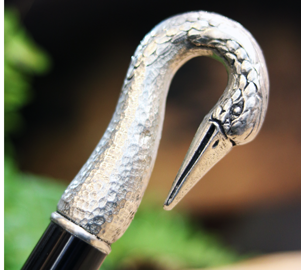 Splendide canne avec poignée sculptée en étain massif représentant un splendide cygne.