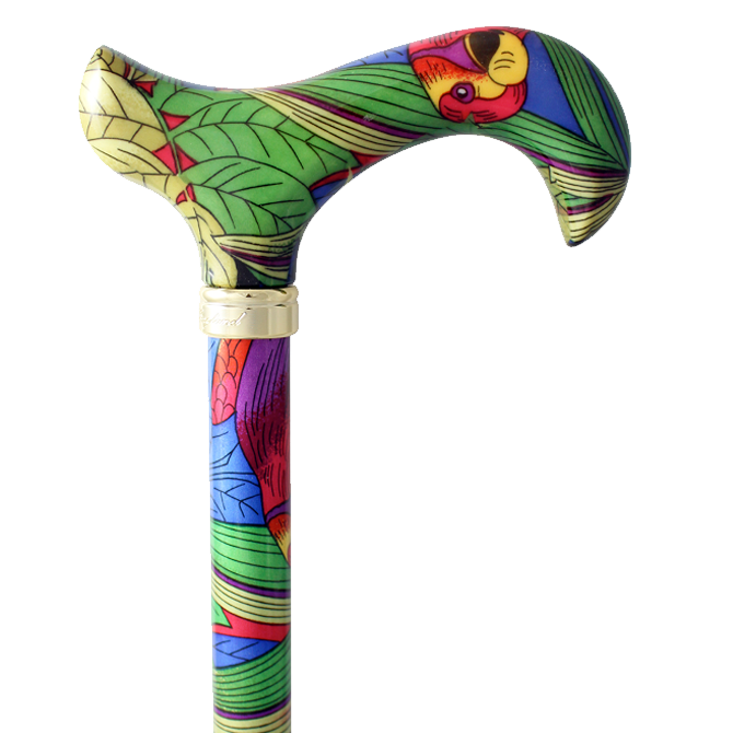 Faites sensation avec cette canne de marche Fashion Derby "Tropicana Parrot" ! Inspirée de la jungle luxuriante, elle arbore des tons vifs de vert, jaune, bleu, violet et rose, ainsi que des perroquets colorés cachés dans le feuillage tropical.