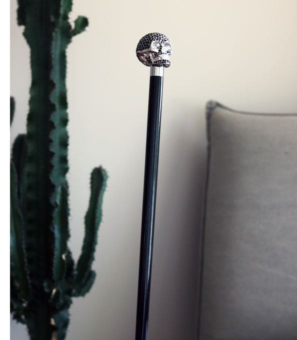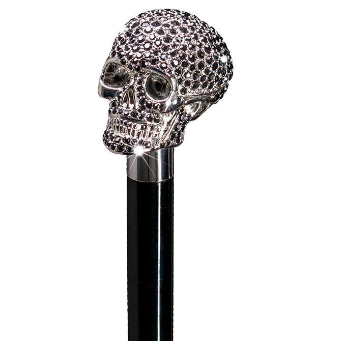 Affirmez votre style avec cette canne au design audacieux et raffiné. Son pommeau en tête de mort, orné de strass noirs incrustés à la main pour un éclat unique.