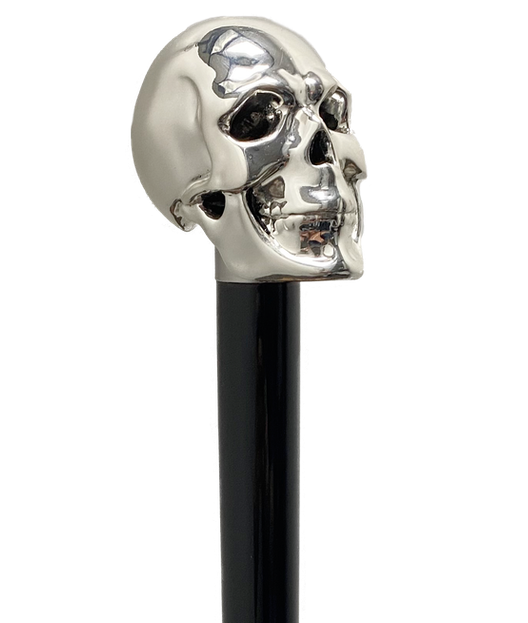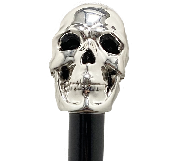 Splendide canne avec poignée sculptée en métal argenté représentant tête de mort.