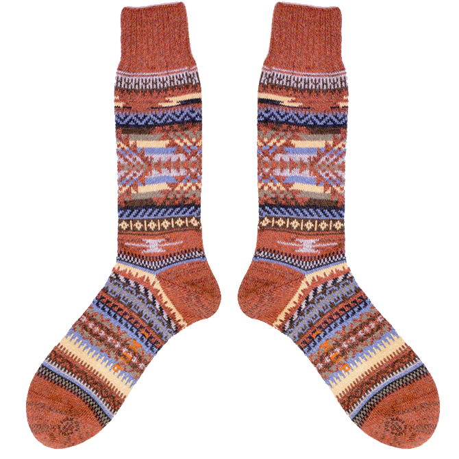 Le motif des chaussettes Dia est inspiré des tapis Américains. Elles sentent bon le rêve américain, les cowboys et les grands espaces.
