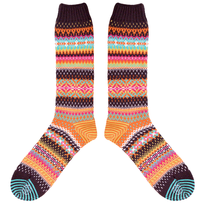 Le motif des chaussettes Ruska est inspiré d'un jour d'automne dans une forêt finlandaise. Un paysage coloré, qui vire au rouge, au brun et ou les feuilles automnales se reflètent dans le lac.